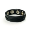 Anello per il pene in pelle con tre chiusure a pressione, disponibile in nero con striscia gialla o rossa.