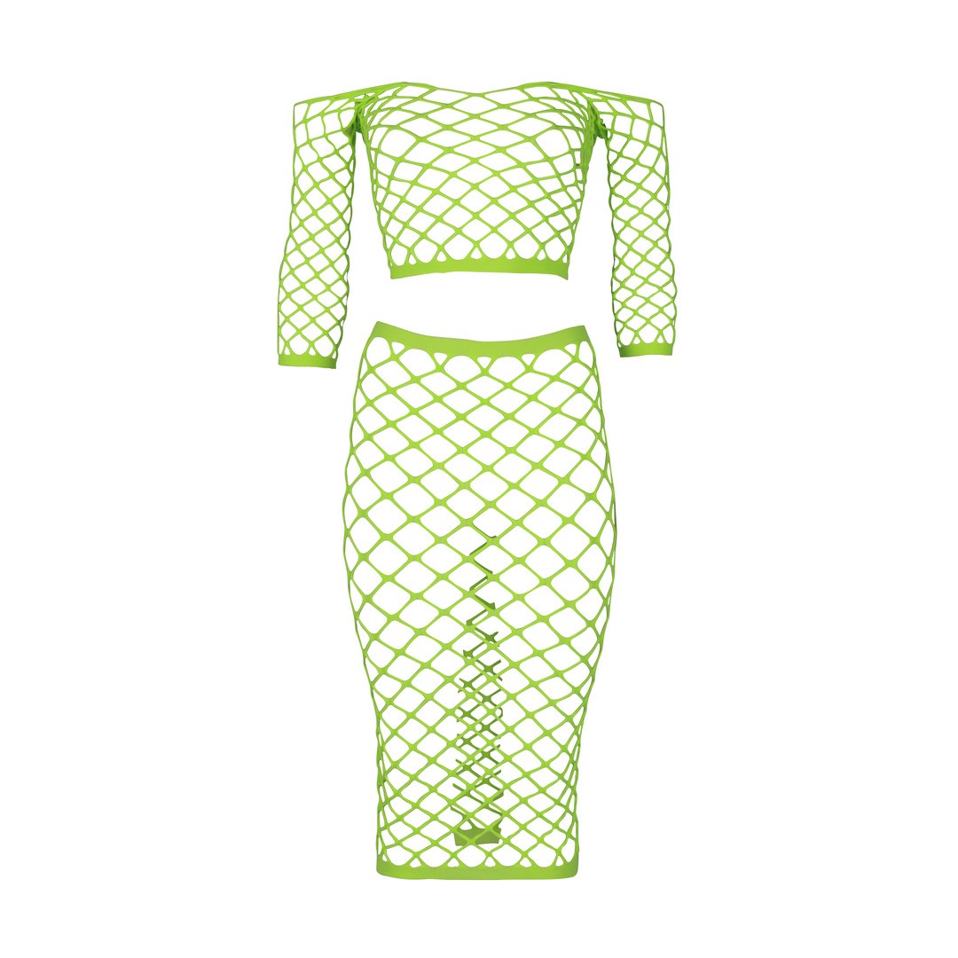 Set Neon UV — top corto e gonna lunga che brillano sotto la luce UV, per un look vibrante e irresistibile.