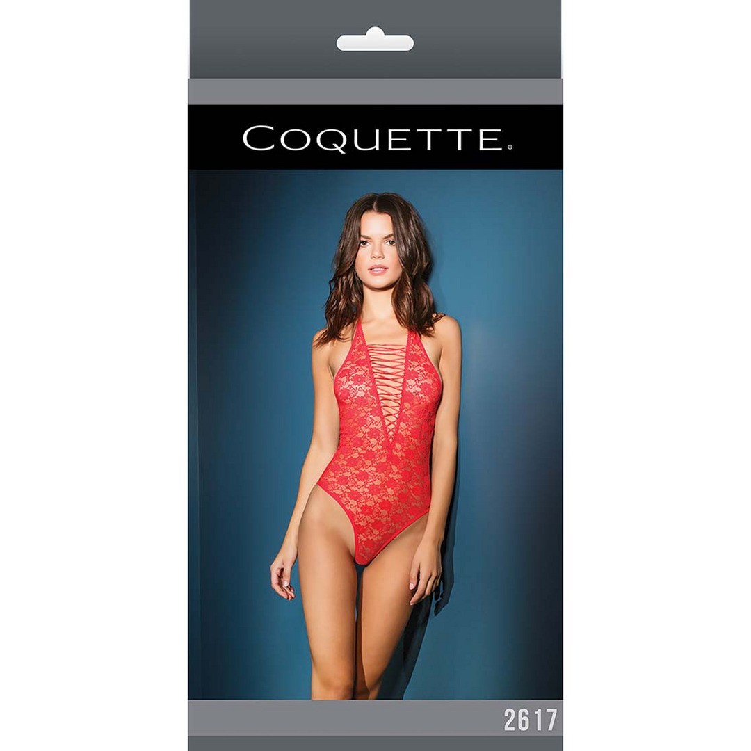 Body con scollo a V sul davanti, in pizzo elasticizzato e taglio alto sulla gamba, per un look elegante e sensuale.