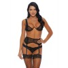 Set di 3 pezzi con reggiseno a V, reggicalze e tanga in maglia e pizzo delicato.