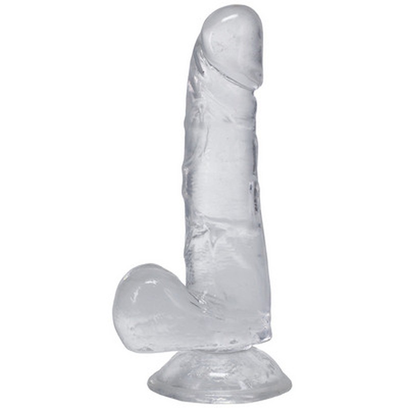 Dildo trasparente da 15 cm con venature realistiche, scroto rigido e ventosa per un piacere con o senza mani.