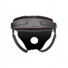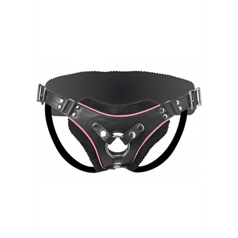 Imbracatura vegana con dettagli rosa, completamente regolabile e compatibile con dildo di varie dimensioni.
