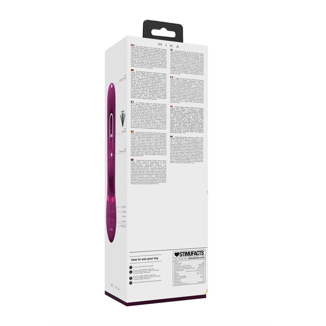 Inoltre, come tutti i vibratori della gamma VIVE, MIKA è dotato di una garanzia di un anno, che assicura qualità, durata e totale fiducia nella vostra scelta.