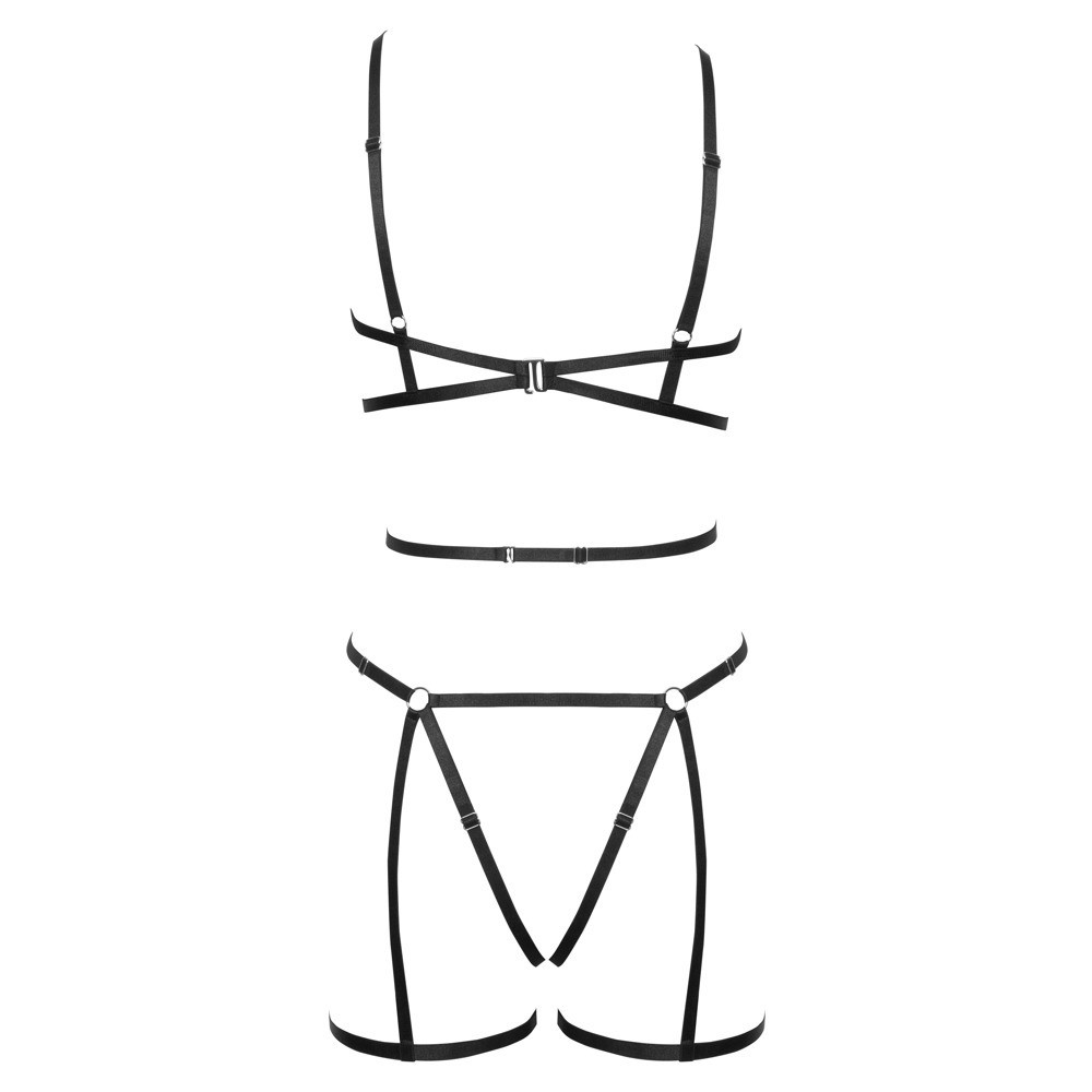 Il set di imbracature nero a 3 pezzi di Cottelli LINGERIE comprende un'imbracatura per il seno e una per i fianchi. È incluso anche un piccolo perizoma. Entrambi gli imbracature sono realizzati con cinturini elastici in velluto, morbidi e lucidi, con anelli di collegamento argentati. I cinturini possono essere regolati per una vestibilità perfetta. Ci sono 2 chiusure a gancio nella parte superiore: una dietro al collo e l'altra sul retro.