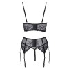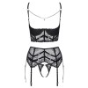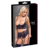 Un reggiseno con scollo profondo, una cintura reggicalze e un prerizoma senza cavallo si combinano per formare un set elegante ed erotico di Cottelli LINGERIE. Tutti i capi sono realizzati in morbido pizzo nero, delicato ed elastico, con spalline in velluto e dettagli in anelli argentati.