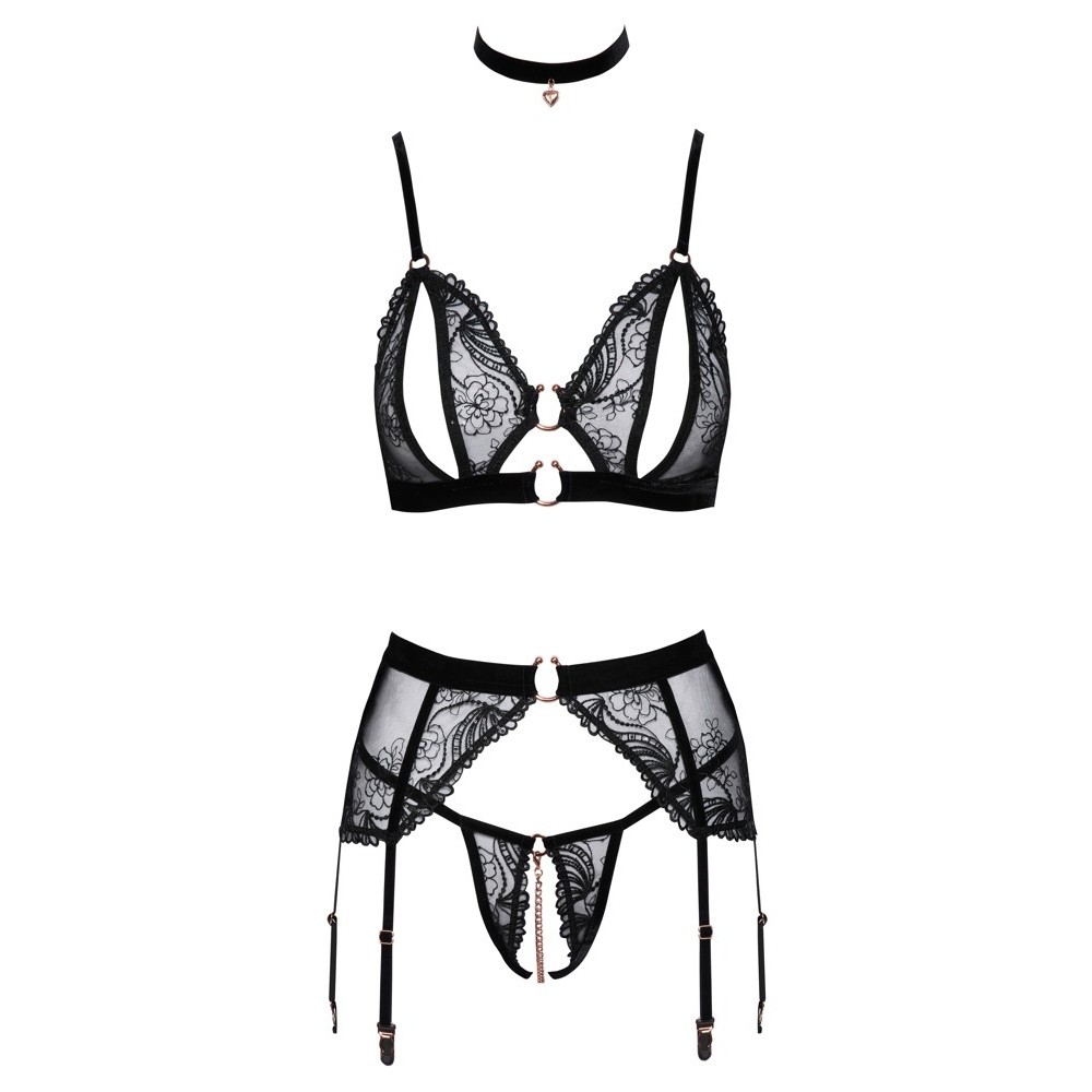 Set elegante ed erotico di Abierta Fina composto da reggiseno senza ferretto, reggicalze, perizoma senza cavallo e collana in velluto. Realizzato in delicato tulle nero con ricami elaborati e piccole paillettes decorative, è completato da accessori in tonalità oro rosa e spalline elastiche in velluto, che ne rafforzano il carattere sofisticato.