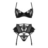 Questo splendido set di lingerie combina eleganza e stile sensuale audace. Realizzato in tulle di pizzo nero e tessuto wetlook, valorizza perfettamente le curve femminili aumentando la fiducia. Il reggiseno con ferretto e coppe in pizzo mette in risalto il décolleté garantendo comfort. La giarrettiera alta con delicati volant sottolinea la vita, e le cinghie regolabili permettono una vestibilità perfetta. Il set si completa con un sensuale perizoma che armonizza con il resto dell'insieme.
