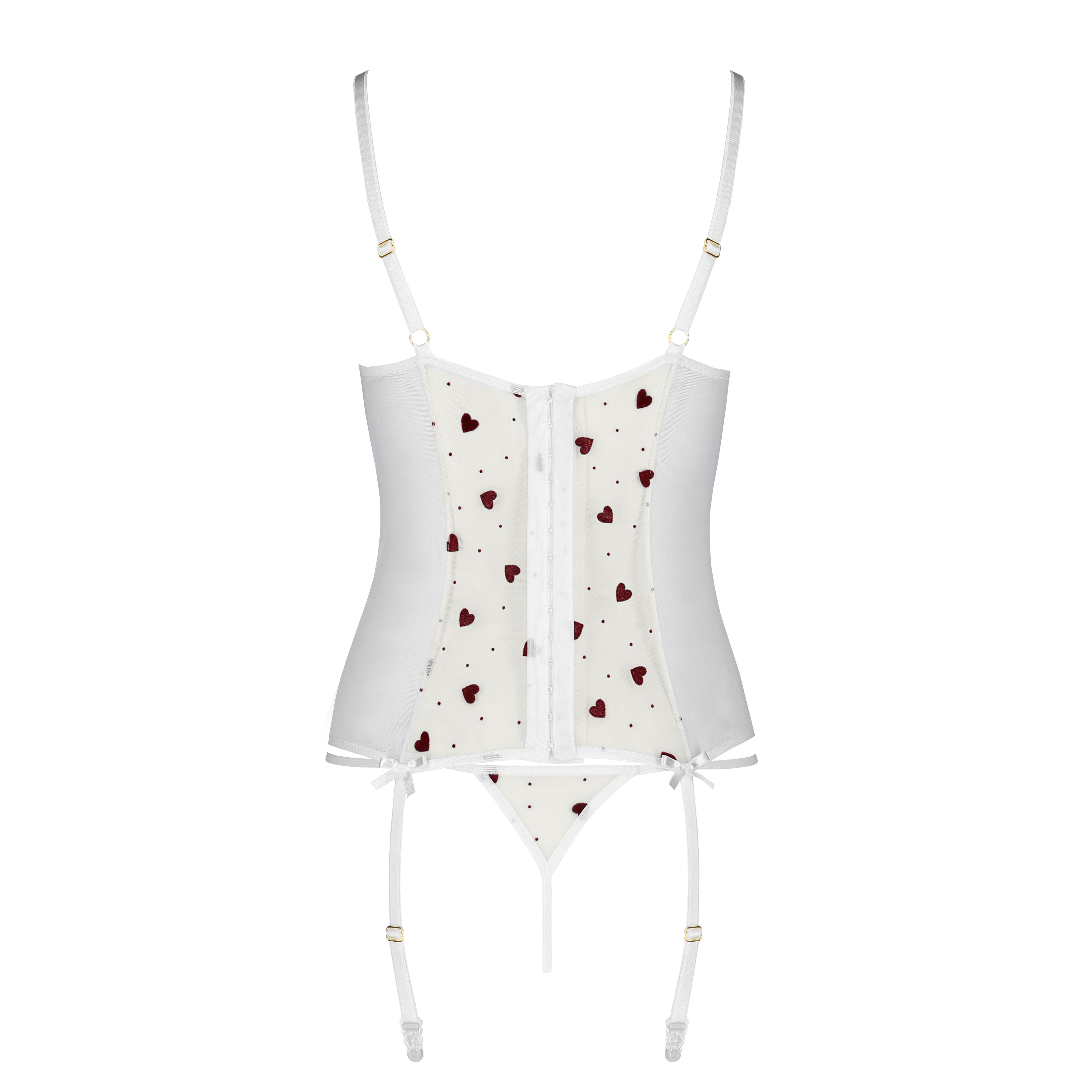Realizzato in tulle con motivi a cuore, questo set è una combinazione perfetta di romanticismo e seduzione.