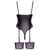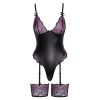 Il body stile tanga, morbido ed elastico, presenta coppe in pizzo senza ferretto e tagli extra alti sulle gambe, anch'essi decorati con pizzo, che esaltano la silhouette. Include anche una pratica chiusura a pressione nella zona dell'inguine. Le spalline del reggiseno e le giarrettiere sono regolabili, mentre le spalline delle giarrettiere possono essere rimosse. Le giarrettiere larghe ed elastiche possono anche essere utilizzate separatamente.