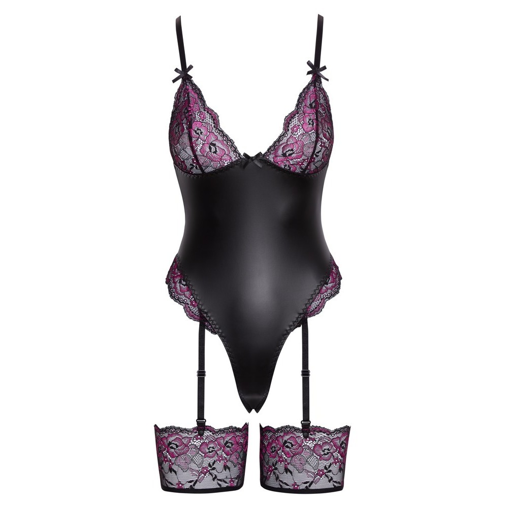 L'elegante body con reggicalze di Cottelli LINGERIE ha spalline e reggicalze rimovibili. È realizzato in sofisticato materiale nero opaco, abbinato a delicata pizzo in due colori (rosa e nero) e impreziosito da piccoli fiocchi neri.