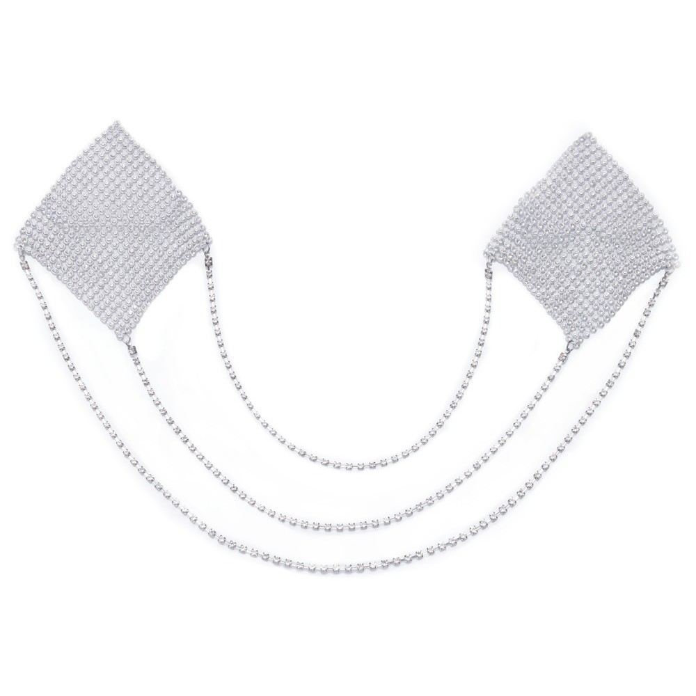 I Nipple Stickers Square argentati di Cottelli ACCESSOIRES hanno una forma a diamante brillante e scintillante con tre delicate catene oscillanti. Gli adesivi per capezzoli possono essere applicati facilmente e possono essere riutilizzati più volte se la pellicola protettiva viene riapplicata prima di riporli.