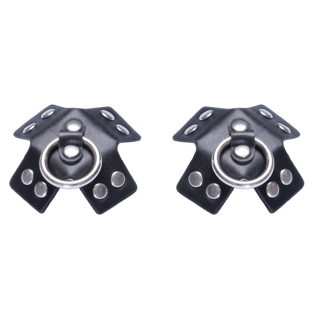 Gli adesivi per capezzoli SM di Cottelli ACCESSOIRES hanno una classica forma a croce e sono realizzati in finta pelle nera. Ogni adesivo ha anche borchie decorative e un anello (di ritenzione). Gli adesivi per capezzoli possono essere applicati facilmente e possono essere riutilizzati più volte se la pellicola protettiva viene riapplicata prima di riporli.