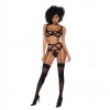 Set di tre pezzi in maglia trasparente con dettagli in elastico. Include top con ferretto per un maggiore sostegno e spalline regolabili, reggicalze e perizoma abbinati.