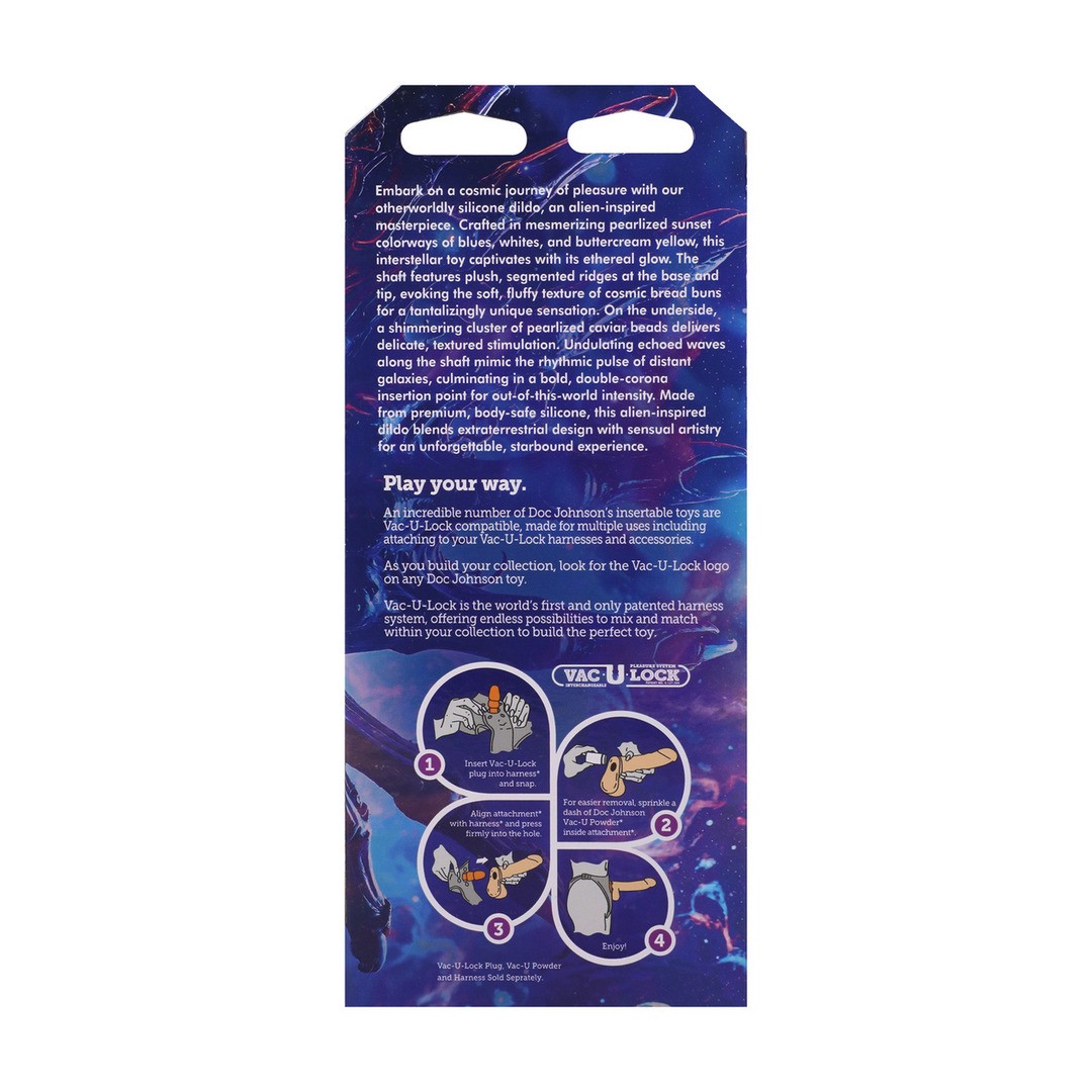 Imbarcati in un viaggio cosmico di piacere con questo dildo alieno in silicone, un capolavoro ispirato all'universo fantascientifico. In ipnotici toni di blu, bianco e giallo crema, brilla con un effetto etereo che seduce al primo sguardo. Il corpo presenta protuberanze segmentate e morbide alla base e alla punta, che evocano la consistenza morbida dei “panini” cosmici per una sensazione unica.