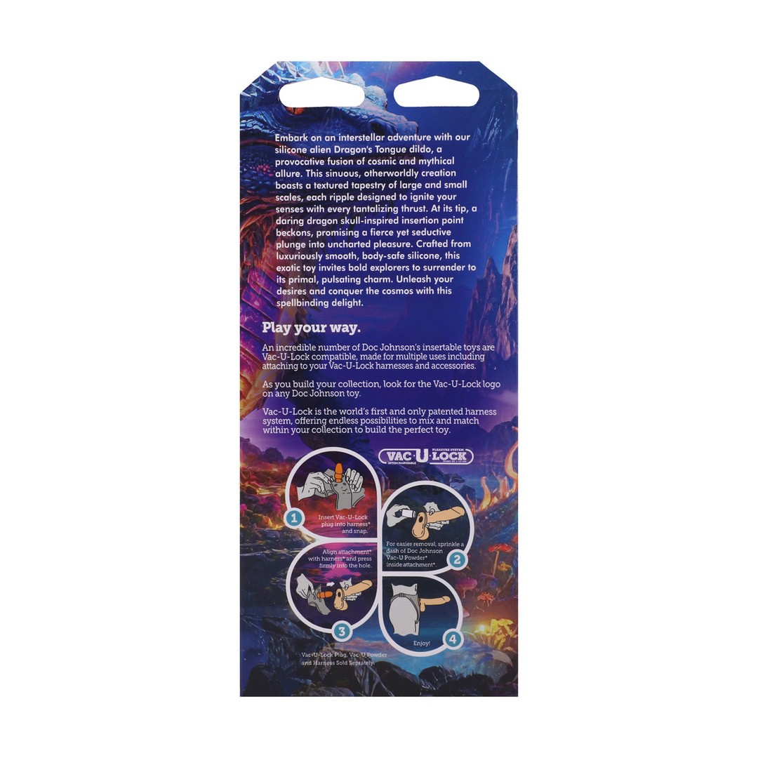 Imbarcati in un'avventura interstellare con Dragons Tongue, un dildo alieno in silicone che fonde il fascino cosmico con il mito leggendario. Con la sua forma sinuosa e ultraterrena, presenta un rilievo dettagliato di scaglie grandi e piccole, con ondulazioni che risvegliano i sensi ad ogni impulso. All'estremità, un audace becco ispirato al teschio di un drago invita a un'inserzione intensa e seducente in territori inesplorati.