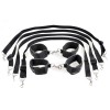As algemas de pulsos e tornozelos podem ser ajustadas com fechos de gancho e laço e ligadas entre si, enquanto as correias com ganchos de pressão permitem prender o corpo a colunas da cama ou outras estruturas.