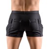 Calções pretos e soltos da Svenjoyment, confeccionados em material ligeiramente elástico com acabamento mate. Inspirados no estilo de trabalhador, apresentam uma fila de botões de pressão na frente, dois grandes bolsos laterais e dois bolsos traseiros, todos com fecho de pressão.