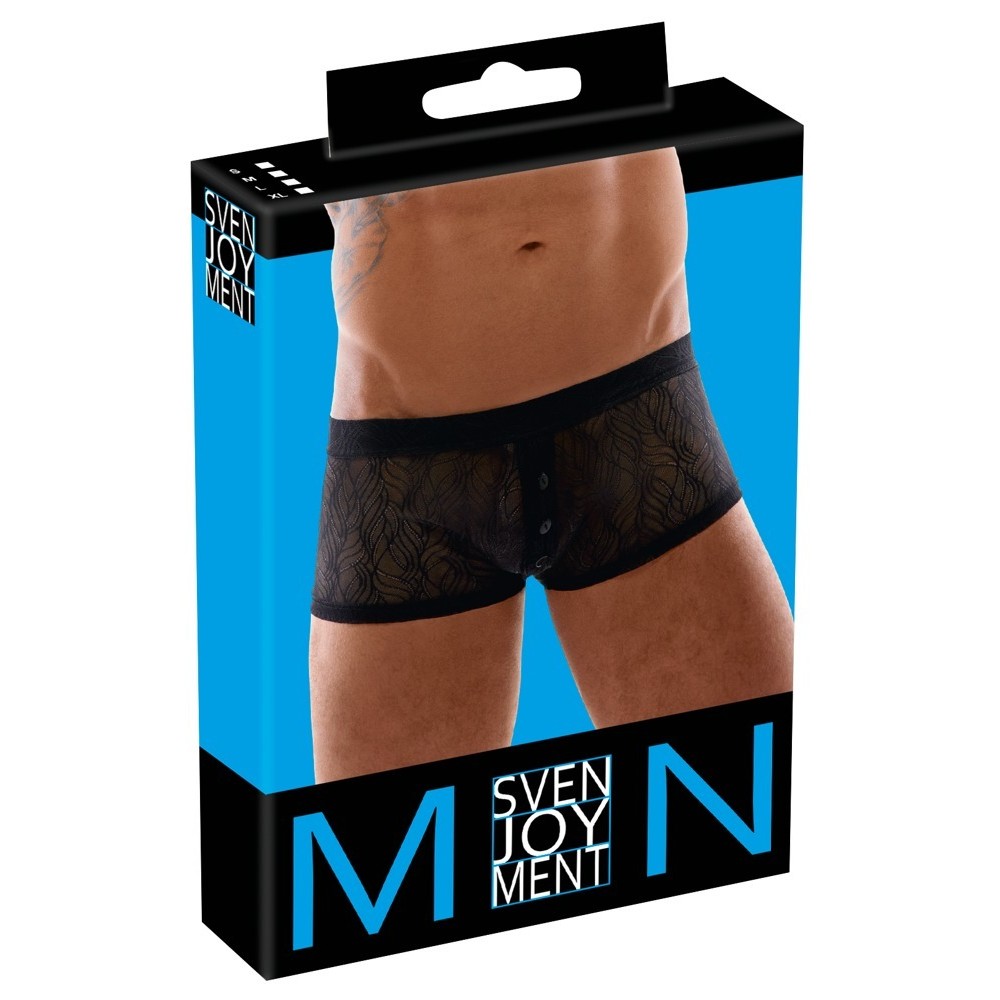 Boxers justos da Svenjoyment, confeccionados em renda elástica fina e macia, com cintura em borracha tecida. A carcela estreita com botões frontais abre-se até à virilha, acrescentando um toque provocante.