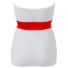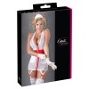 Vestido branco com detalhes vermelhos em cruz, fecho de correr frontal, cintura realçada, bolsos práticos, tiras de suspensórios e decote haltere. Inclui touca de enfermeira com folho vermelho.