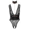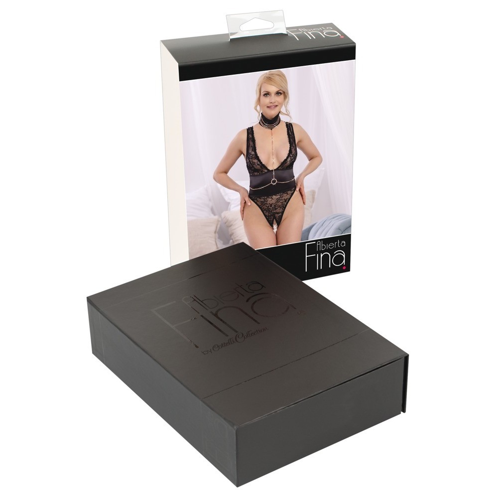 Body sem entrepernas da Abierta Fina, deslumbrante e totalmente confeccionado em renda delicada e macia. A inserção larga na zona da cintura, em cetim firme e elástico, realça as curvas de forma elegante. Apresenta um decote profundo à frente e um decote em V igualmente acentuado nas costas. A gola larga e as correntes decorativas ao redor do pescoço e da cintura intensificam o visual sofisticado e sensual. As correntes com fecho de pressão, adornadas com strass em tom ouro rosa, são amovíveis para maior versatilidade.