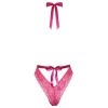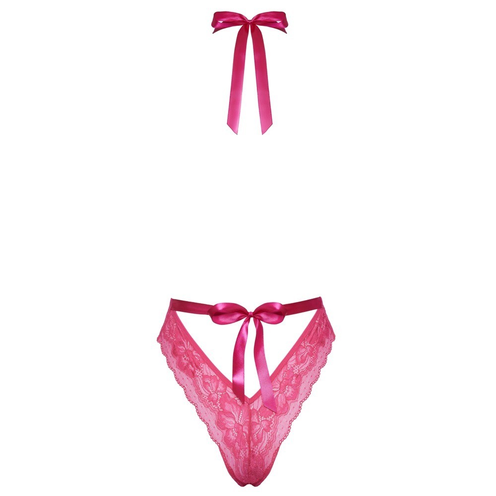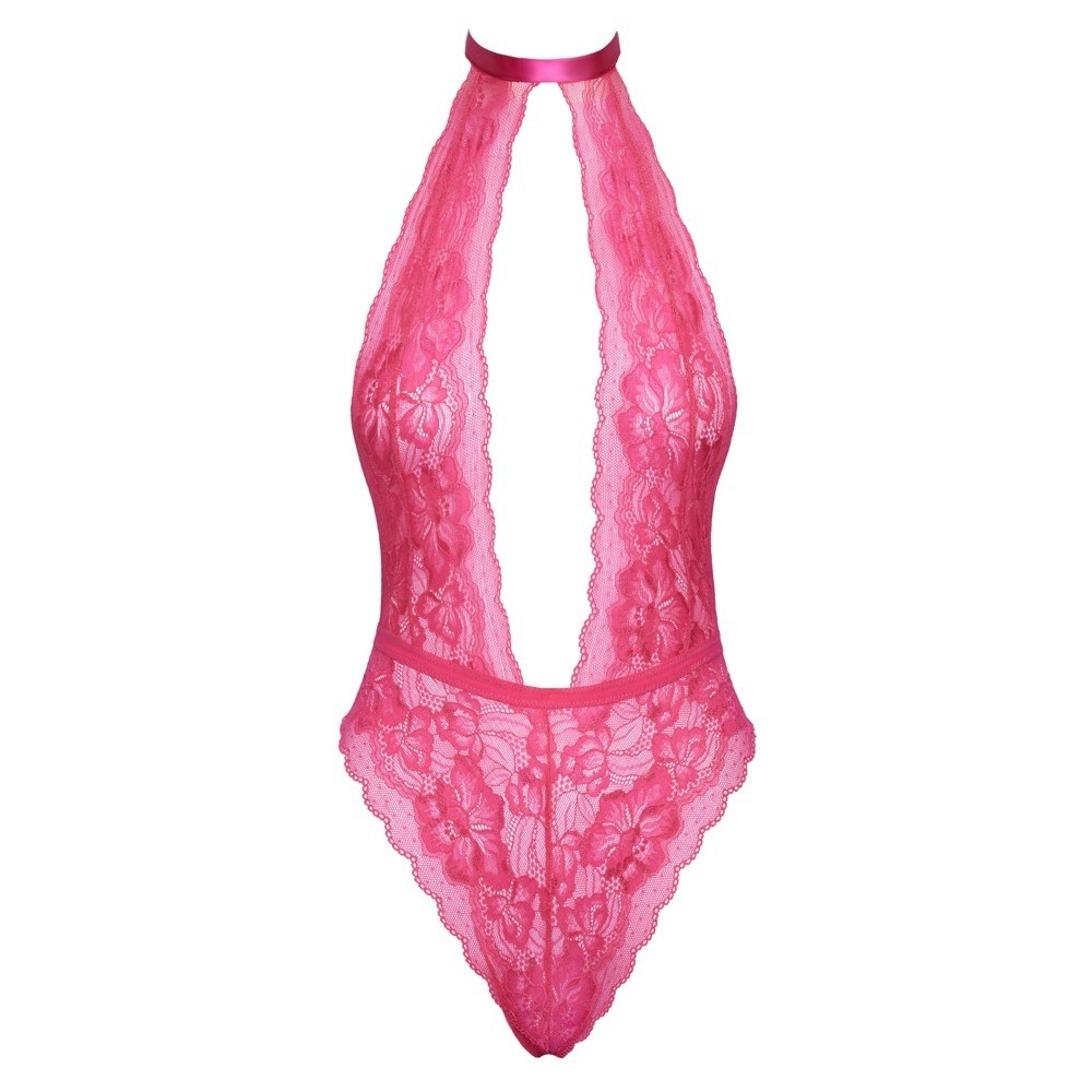 Body atrevido e sedutor da Kissable, inteiramente em renda fina cor-de-rosa. Macio e elástico em todo o corpo para máximo conforto. Design provocante com um grande recorte frontal desde o pescoço até à cintura. Sem costas, com decote halter e fita de cetim para atar no pescoço, complementado por uma fita de cetim na cintura, posicionada num corte em V acima da zona inferior.