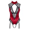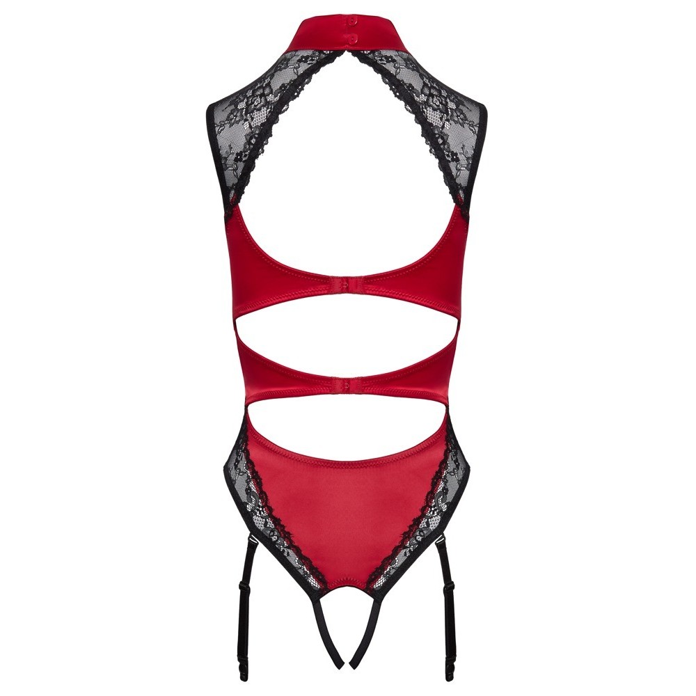 Body sensacional com tiras de ligas da Cottelli LINGERIE, em cetim vermelho sofisticado com inserções em renda preta fina. Macio e elástico em todo o corpo para o máximo conforto. Corte requintado com gola de cetim abotoada, renda cobrindo os ombros e decote revelador. Dois fechos de gancho ajustáveis nas costas quase abertas. Duas tiras elásticas atravessam a virilha aberta. As tiras de ligas são ajustáveis e totalmente amovíveis.