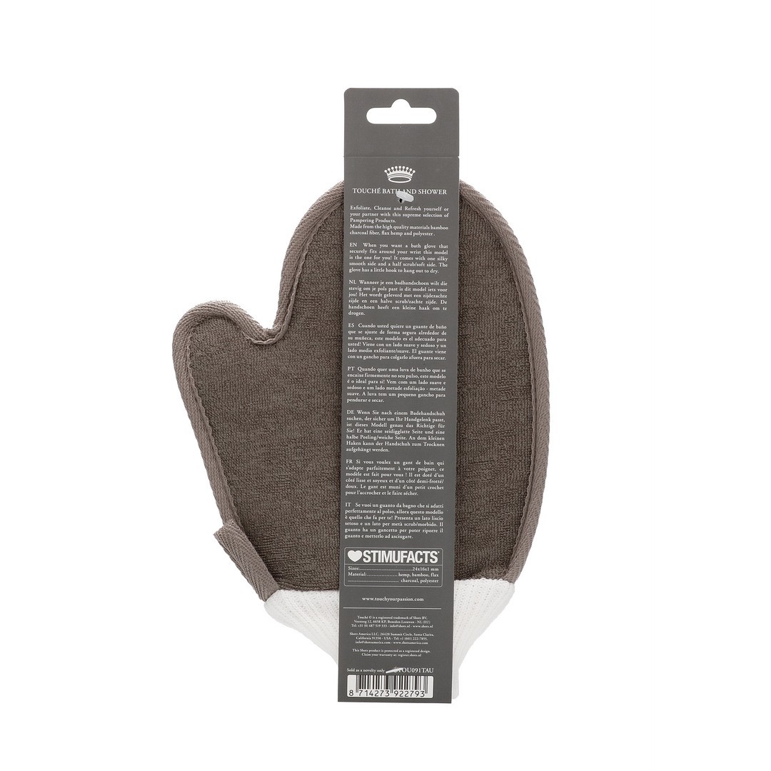 A Luva de Banho Touché com punho mantém-se segura no seu pulso mesmo durante a sessão de esfoliação mais vigorosa. Com um lado sedoso e um lado meio esfoliante/suave, não terá qualquer dificuldade em esfregar ou lavar o stress do dia! As fibras naturais de Linho e Cânhamo são ideais para esfoliar e proporcionar um brilho saudável à sua pele. O componente de Carvão Vegetal ajuda a extrair as impurezas diárias e remove suavemente a acumulação de sujidade e toxinas dos seus poros. Basta colocar na mão e adicionar o seu produto de limpeza ou esfoliante corporal preferido e está pronta para devolver à sua pele o seu brilho natural. A luva tem um pequeno gancho para pendurar para secar.