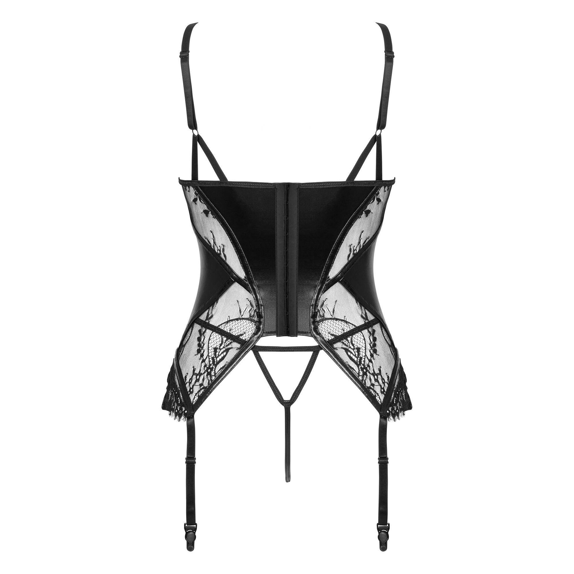 Um belo e erótico corpete da série Leonela em preto. A combinação de rendas delicadas com material semelhante ao látex despertará o desejo de muitos homens. Este corpete é a escolha perfeita para qualquer cliente exigente.