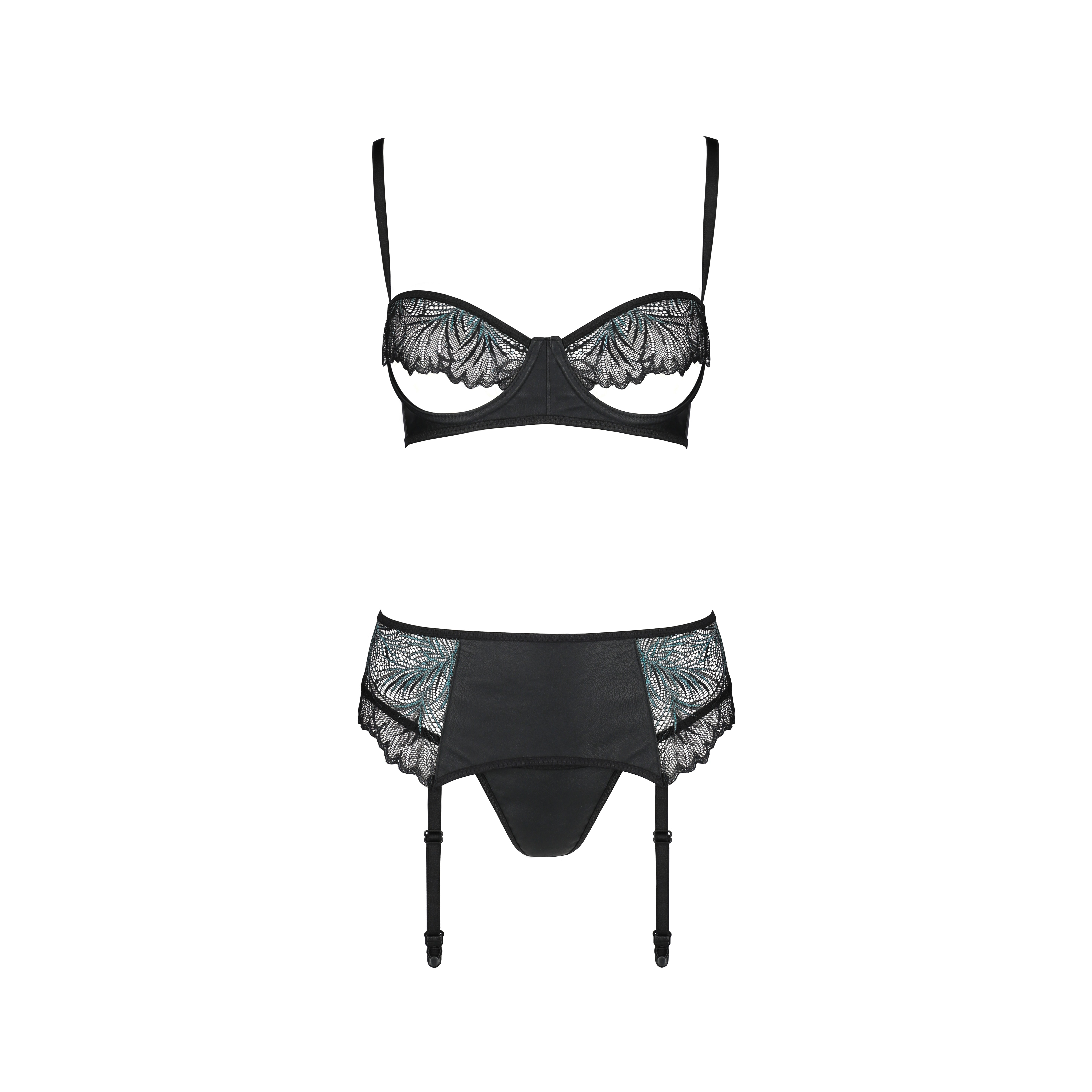 O conjunto Astrida é uma combinação sedutora de sutiã, tanga e cinto de ligas, com renda preta e detalhes em verde, para uma noite de sofisticação e elegância.