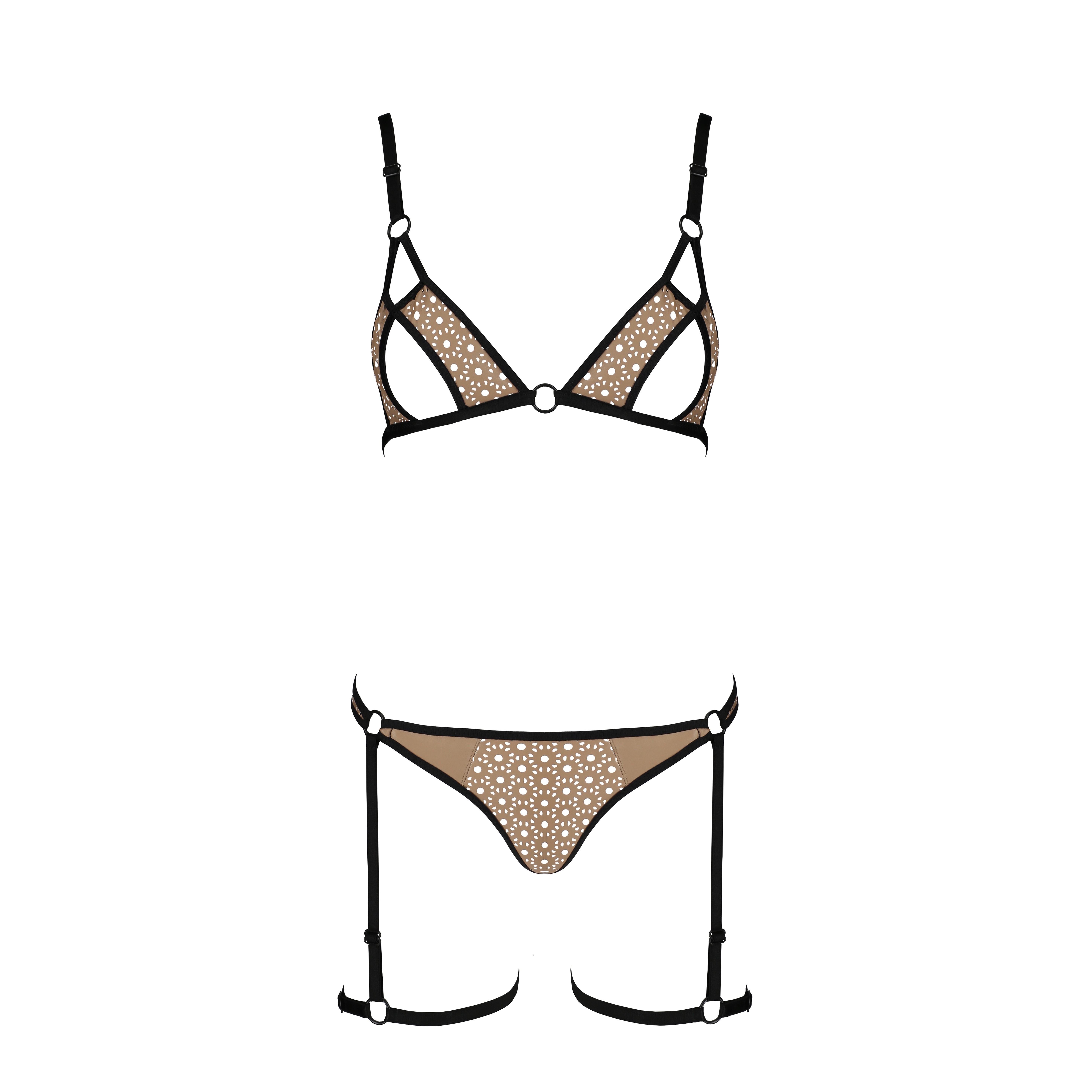 O conjunto Gabi combina recortes sensuais e anéis de união, realçando o busto e as coxas de forma única. É fabricado com materiais de elevada qualidade que proporcionam conforto e durabilidade.