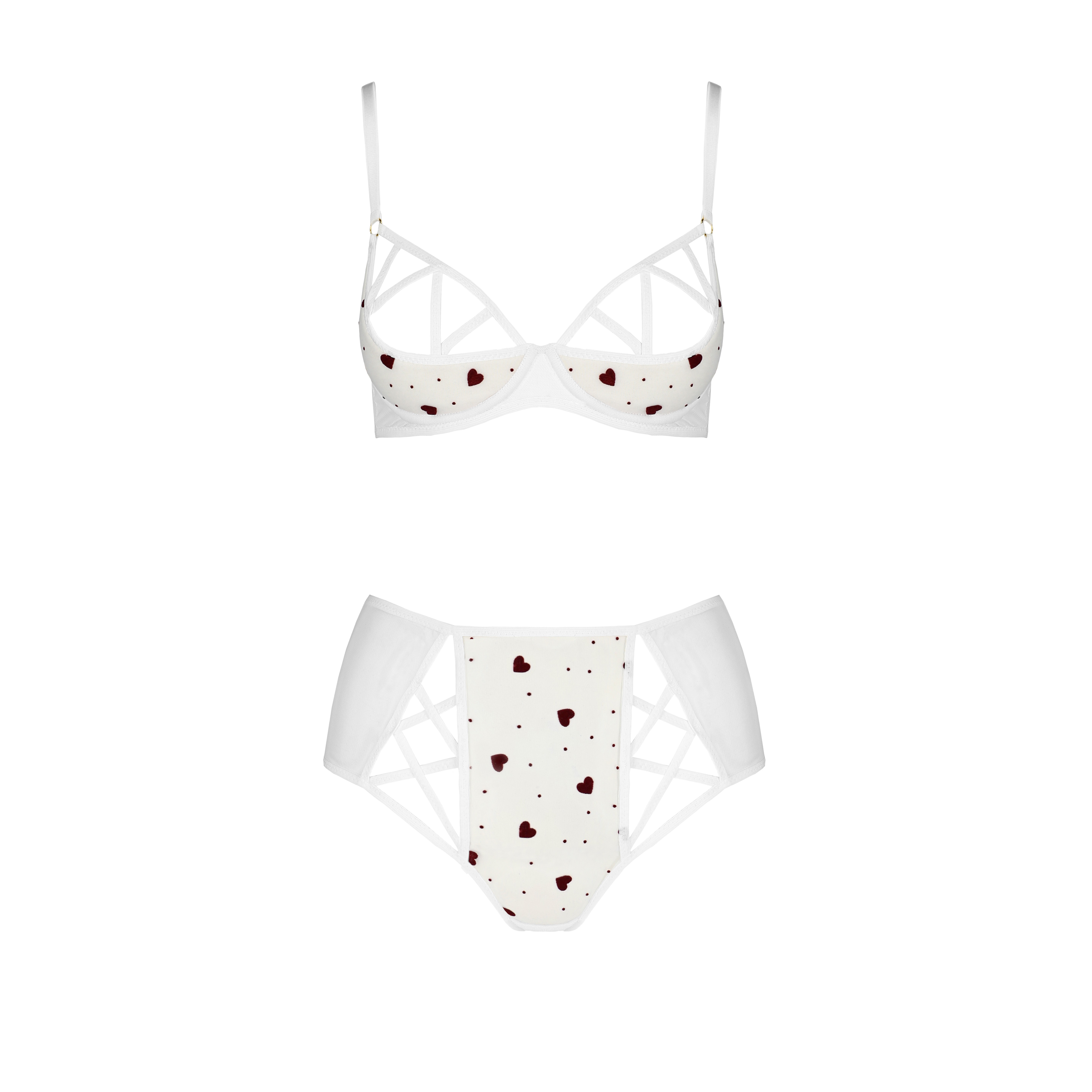 O sutiã, com aros reforçados e recortes estratégicos, proporciona um ajuste ideal, realçando as curvas com sofisticação. A tanga, confecionada em tule delicado com um padrão romântico de corações, adiciona um toque irresistível ao conjunto.