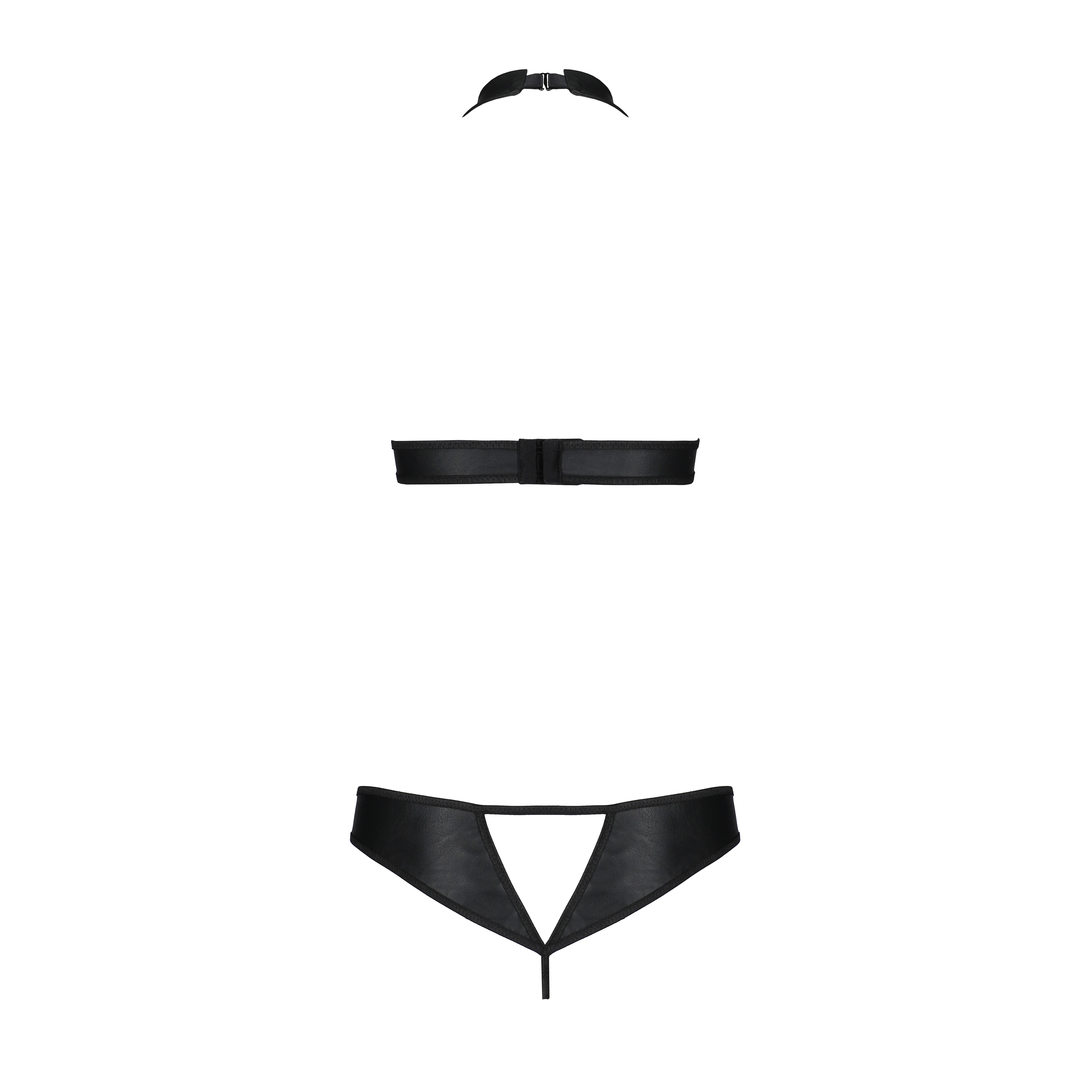 A tanga, que combina com o top, tem uma abertura entre as pernas, a mesma é adornada com duas argolas douradas que intensificam a sensualidade. Na parte de trás, o recorte ousado adiciona um toque sexy e sedutor.