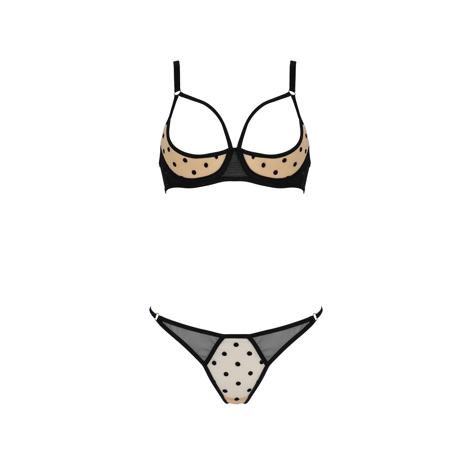 O sutiã tem copas semi-abertas, com alças finas que envolvem os seios, criando um efeito delicado e, em simultâneo, ousado, com os seios expostos de maneira tentadora.