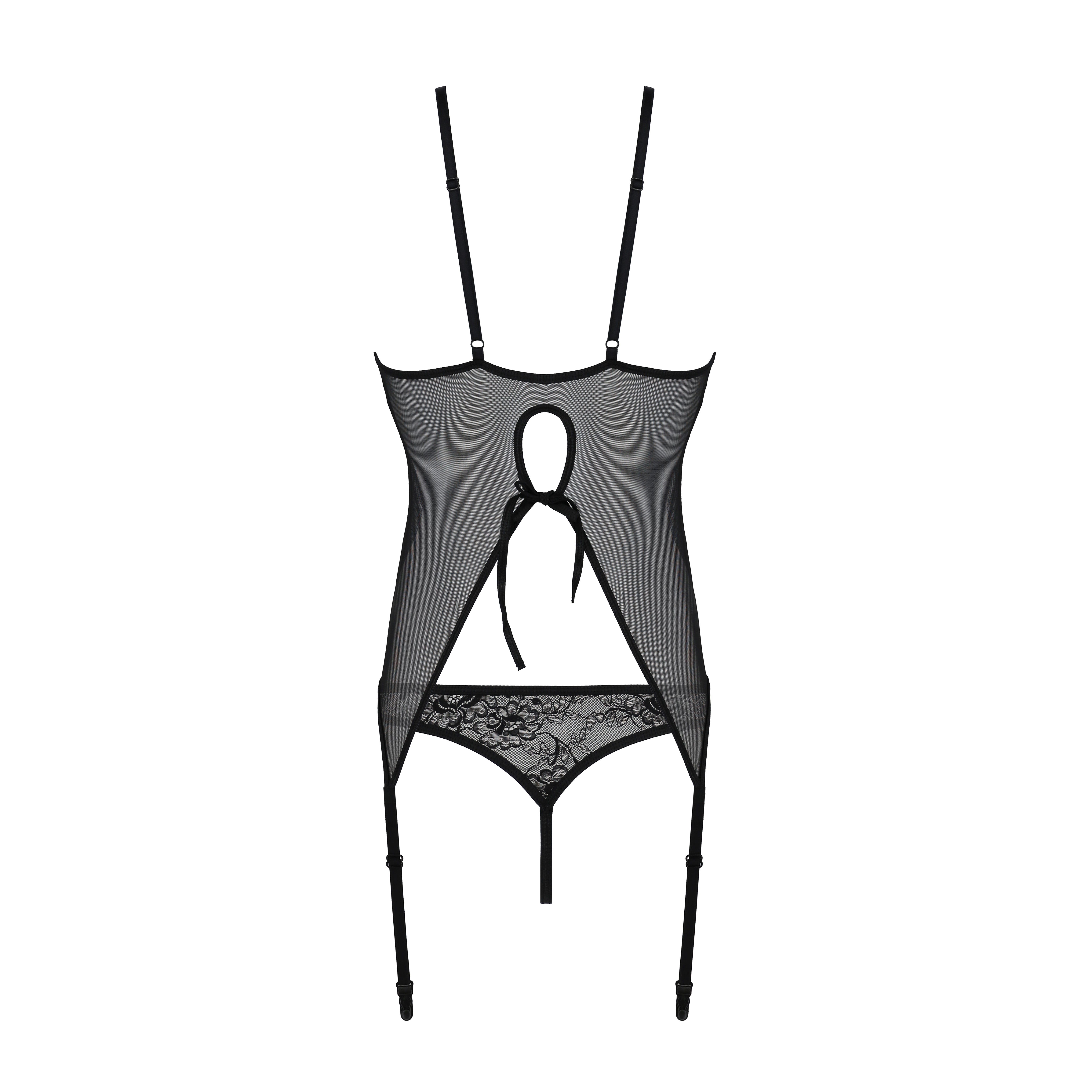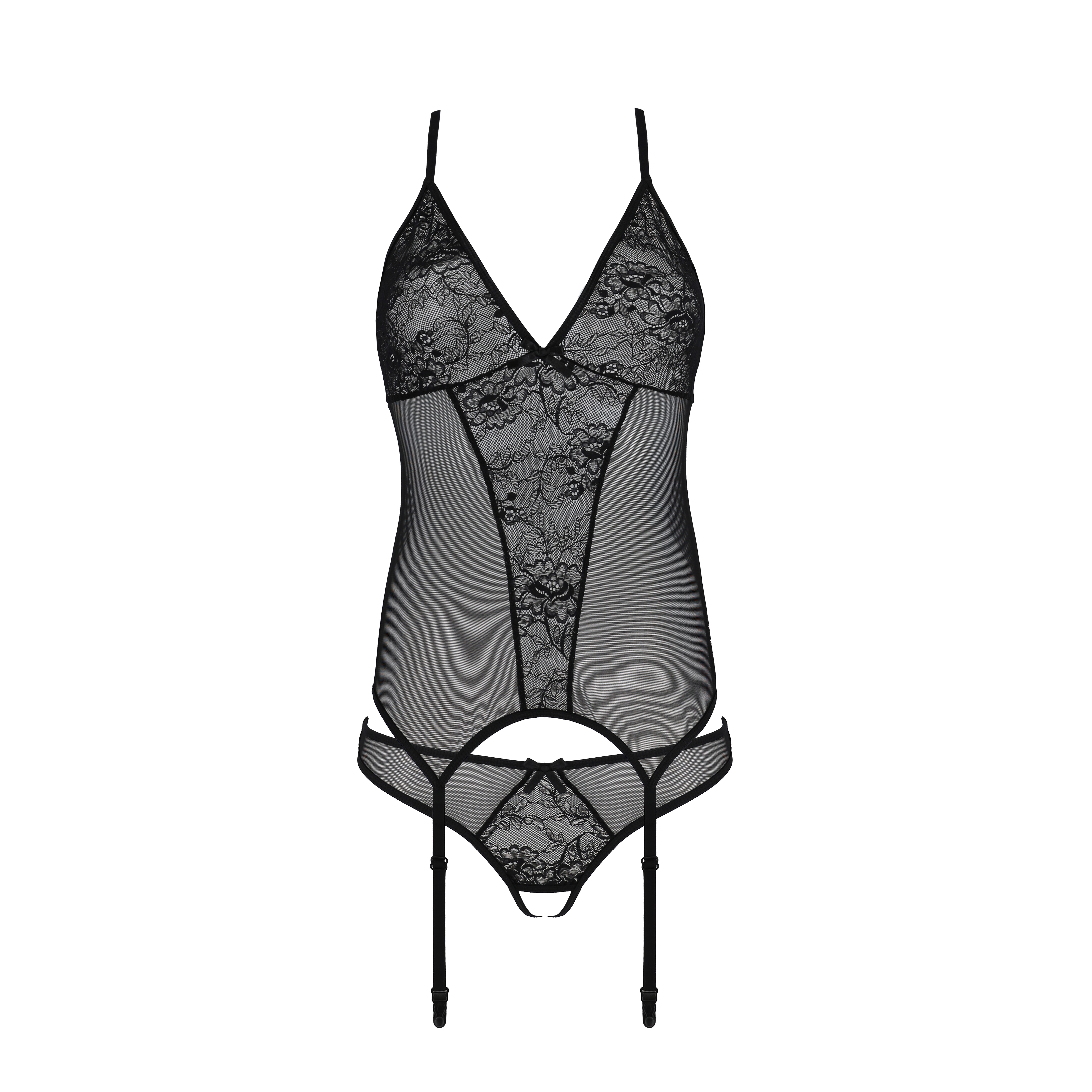 O corte meticuloso valoriza a silhueta, conferindo um efeito esbelto e sedutor, enquanto os detalhes rendados criam um toque de mistério e romantismo. Ideal para ocasiões especiais, o conjunto é composto por um corpete ajustável que se adapta confortavelmente ao corpo e uma tanga igualmente elegante, criando um equilíbrio perfeito entre funcionalidade e beleza. Dispõem de tiras para meias de liga o que confere um toque ainda mais sensual!