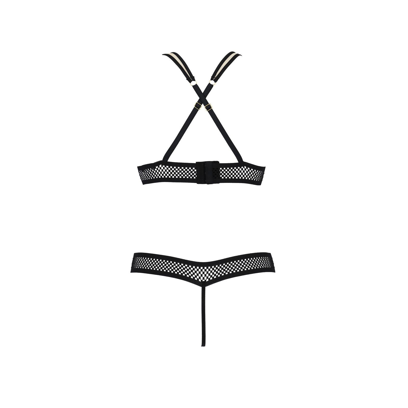 O conjunto é composto por um sutiã com um corte original que realça o busto de forma elegante e provocante, e uma tanga aberta delicada que complementa o design.