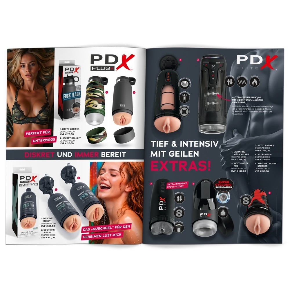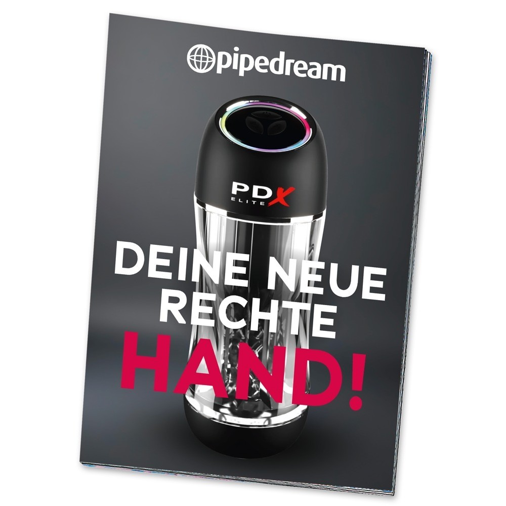 O folheto B2C da Pipedream, a cores e com 8 páginas, tem formato A5 e contém informações e preços dos novos masturbadores.