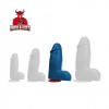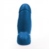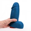 Dildo azul XXL com formato realista, testículos e ventosa removível.