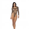 Marque a diferença com este body em malha de rede de manga comprida, adornado com strass deslumbrantes que brilham de todos os ângulos.