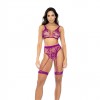 O sutiã apresenta um delicado padrão floral com um detalhe cruzado e provocante na zona do peito, conferindo o toque certo de mistério. A tanga de cintura alta a condizer foi concebida para realçar a silhueta, com ligas integradas que se estendem até se unirem a faixas de liga largas, arredondadas e arrojadas, criando uma silhueta cativante de todos os ângulos.