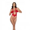 Com copas totalmente abertas, abertura na virilha e um fio dental superfino na parte traseira, deixa muito pouco à imaginação. A malha de rede com design aberto realça cada curva, enquanto as luvas a condizer acrescentam um toque extra de drama e elegância, criando um look marcante para quem gosta de ousar.