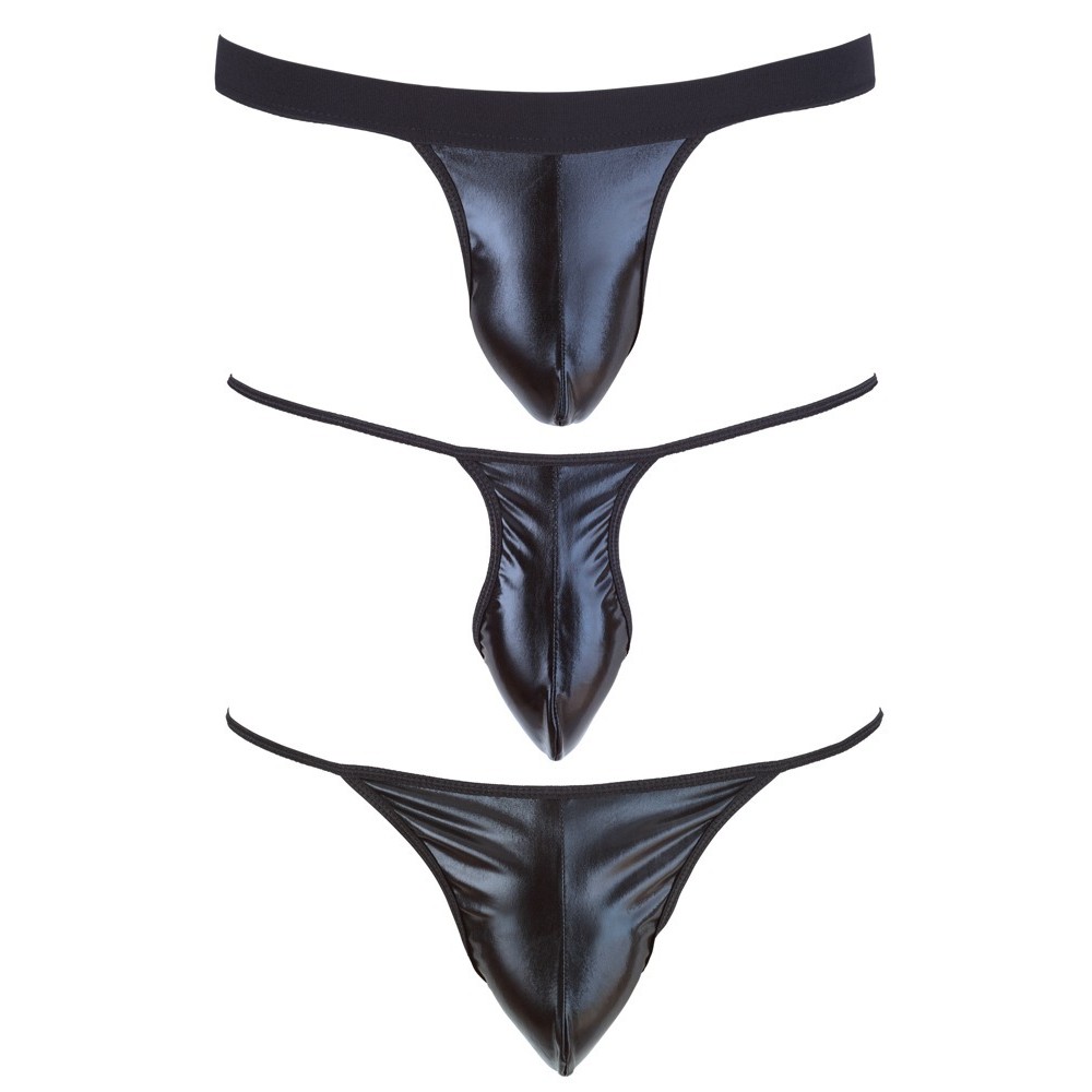 Всегда полезно иметь в ящике с нижним бельем эти три модели: мини-стринги, мини-стринги-G-string и джокстрап. Все они изготовлены из эластичного черного материала с блестящей отделкой и эффектом «мокрого» блеска.
