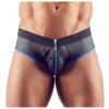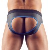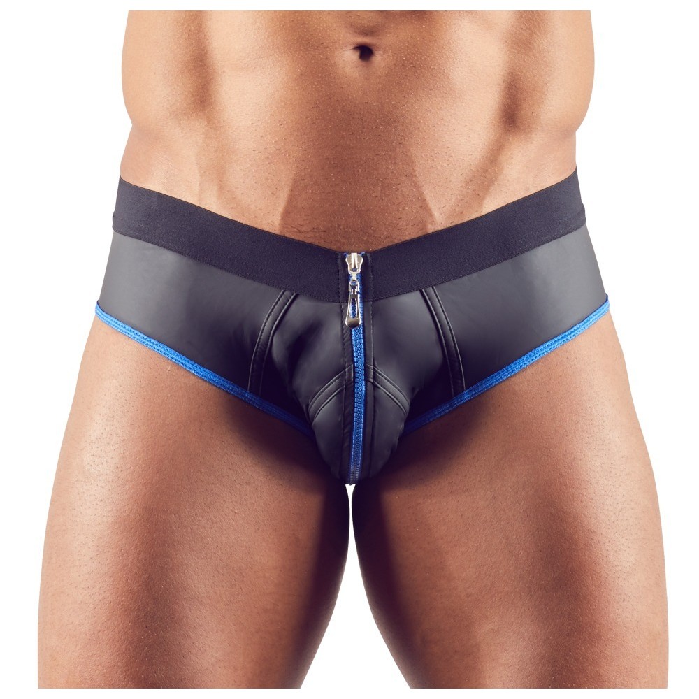 Стринги из материала с матово-блестящей поверхностью, создающего эффект неопрена/резины. Открытая задняя часть придает изделию дерзкий вид, а застежка спереди — это одновременно провокационный и функциональный акцент.