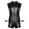 Безрукавный комбинезон с двумя манжетами в комплекте от Svenjoyment BONDAGE. Элегантный дизайн в матовом черном цвете идеально облегает тело, а вставки из сетки на коротких штанинах создают захватывающий визуальный эффект. Спереди имеется застежка-молния, идущая от высокого воротника до талии, а на кармане — дополнительная застежка. По бокам пояса расположены кольца для крепления входящих в комплект манжет, которые регулируются с помощью застежки-крючка и петли для большего комфорта. Сзади шесть дополнительных колец открывают еще больше возможностей для использования.