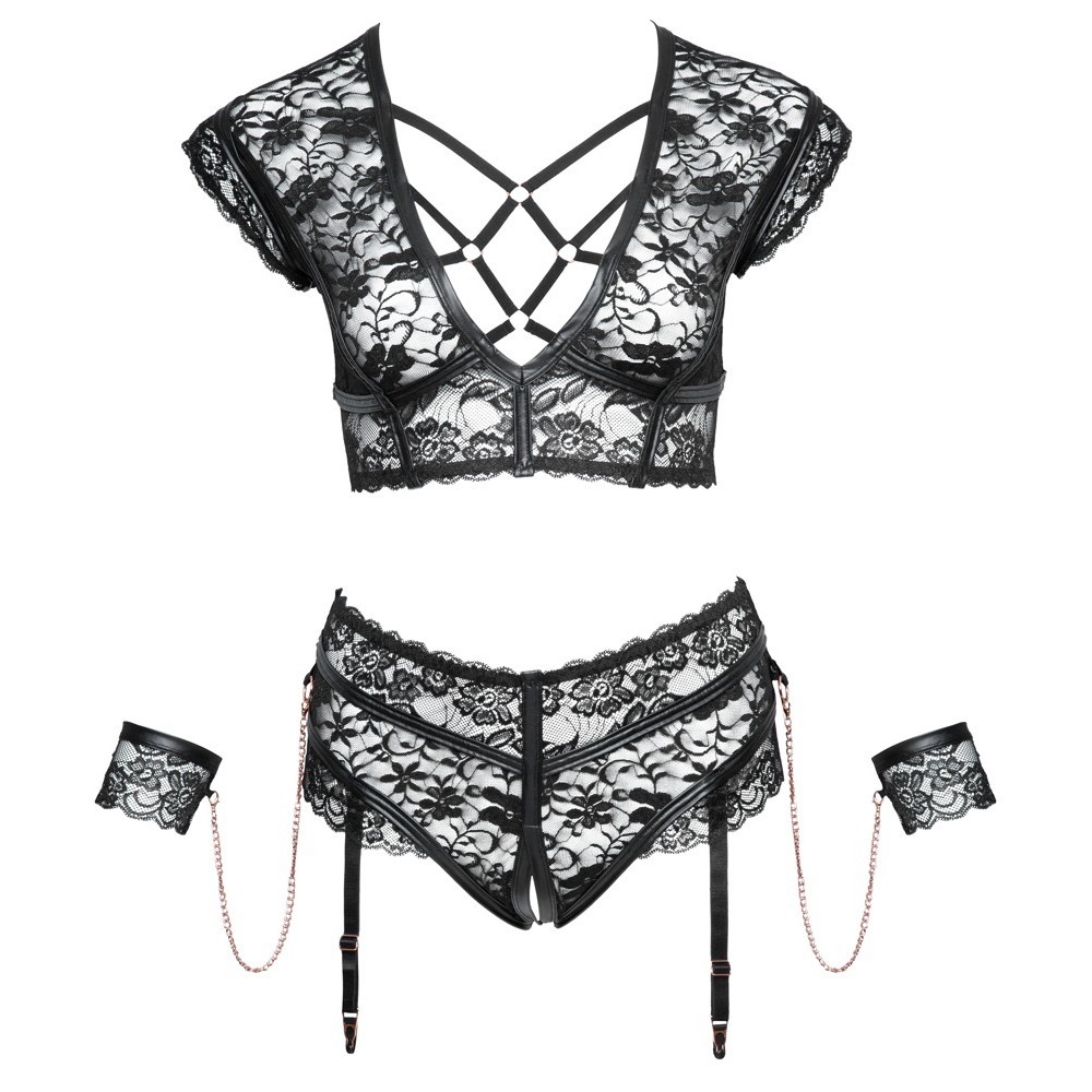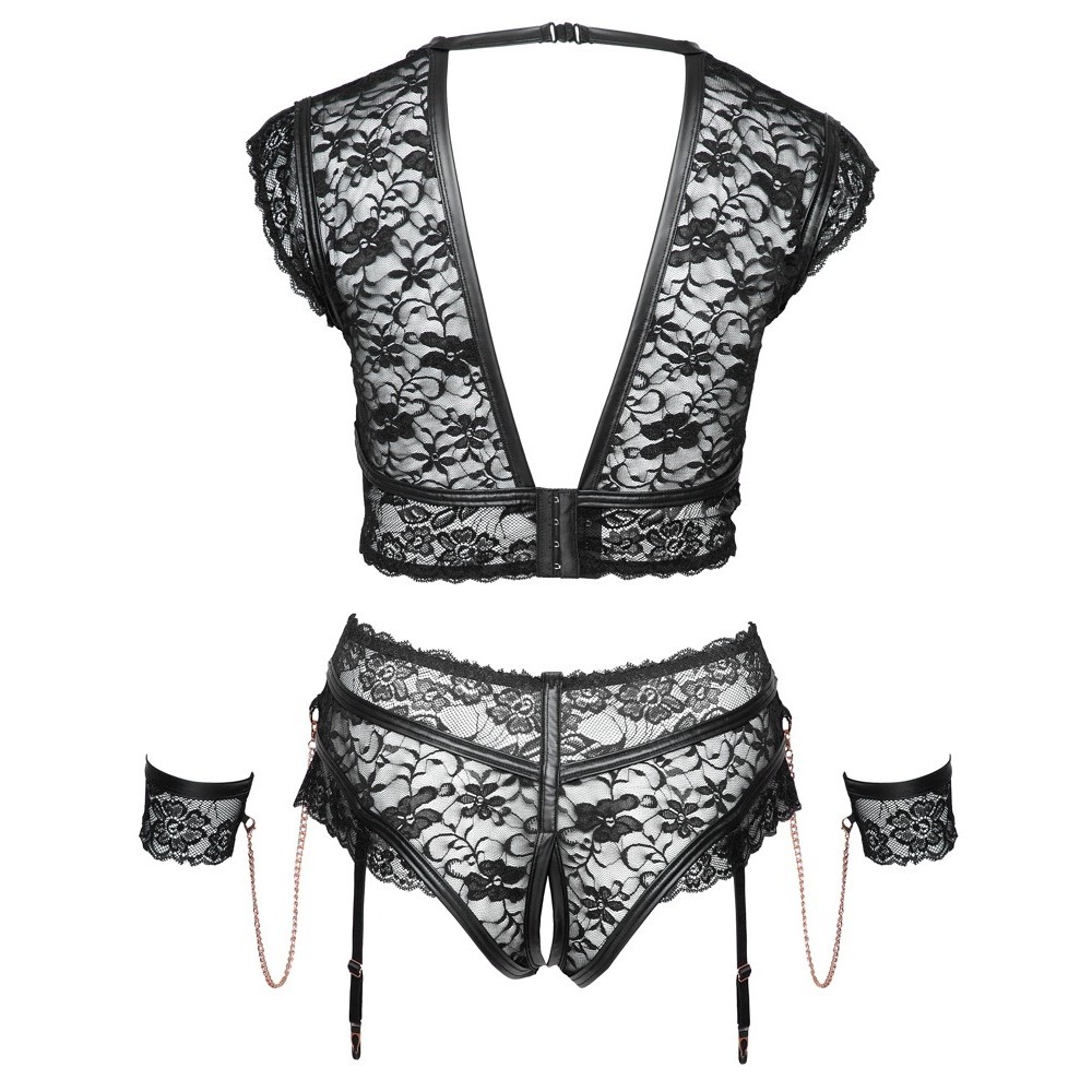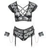 Комплект Cottelli BONDAGE состоит из бюстгальтера без косточек и стрингов с эффектом пояса для чулок без промежности, из мягкого и эластичного кружева с элегантными матовыми ремешками и деталями золотисто-розового цвета. В комплект входят кружевные наручники, которые можно прикрепить к боковым кольцам трусиков с помощью защелок. Бюстгальтер, немного длиннее обычного, имеет декоративные эластичные ремешки на декольте, застежку-клипсу на шее и застежку-крючок на спине. Стринги имеют соблазнительную вырезку в области промежности и регулируемые и съемные ремешки для чулок.