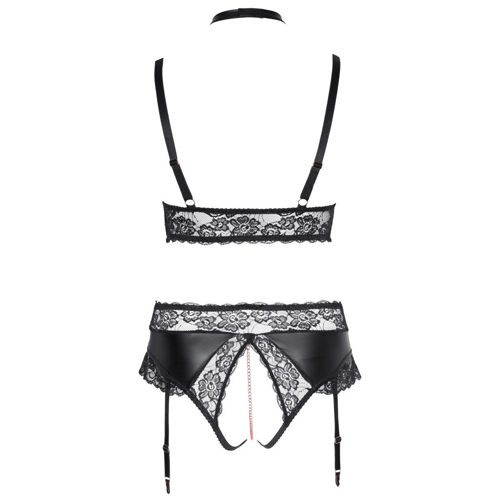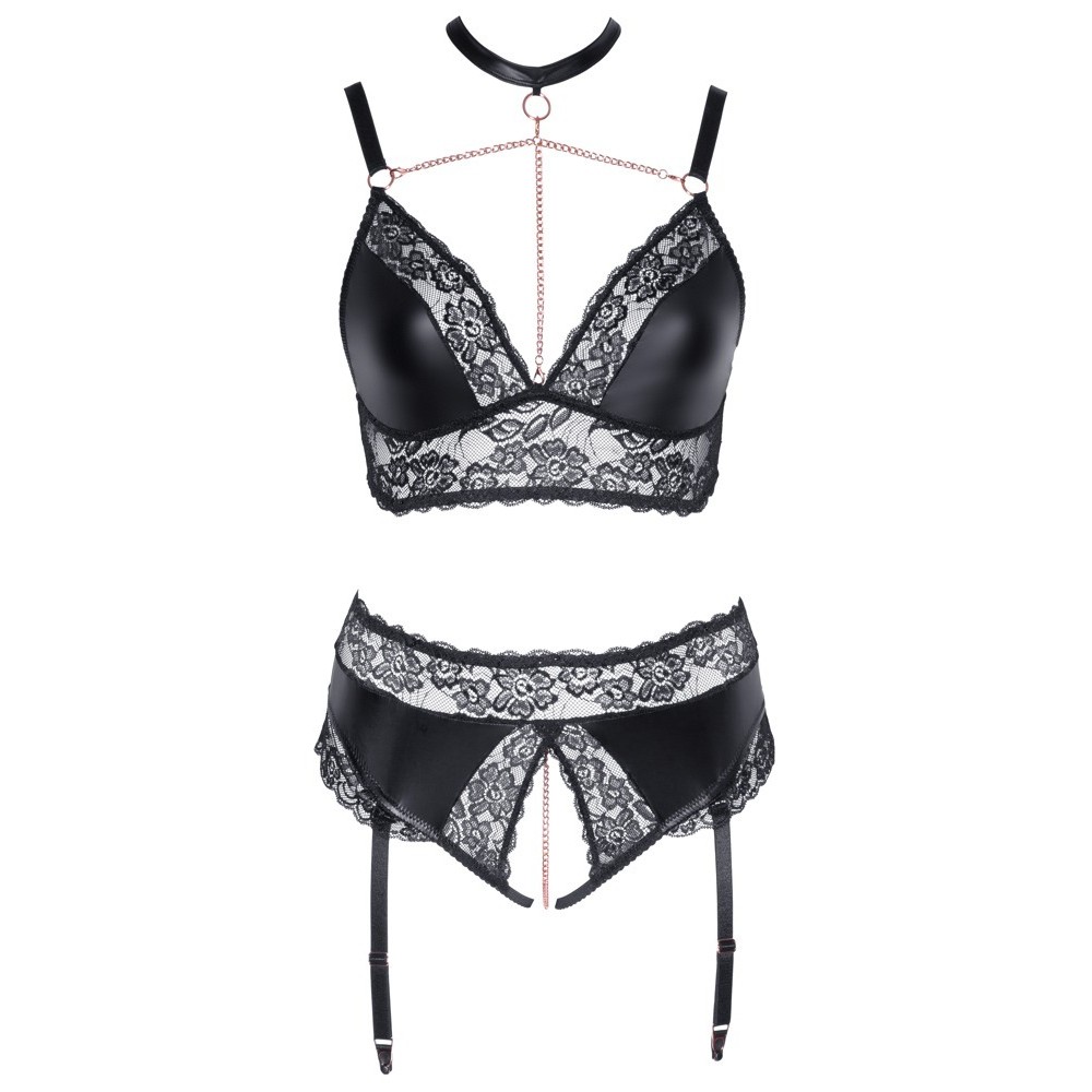 Бюстгальтер без косточек и стринги с подвязками, без промежности, от Cottelli CURVES, изготовленные из комбинации матового материала и мягкого эластичного кружева. Комплект также имеет элегантные детали в розово-золотом цвете. Бюстгальтер выделяется цепочками в области декольте, которые простираются до ожерелья с застежкой-крючком и кольцом. Цепочки и колье съемные. Стринги полностью открыты в интимной зоне и имеют стимулирующую цепочку на промежности. Подвязки регулируются и съемны.
