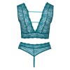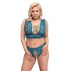 Бюстгальтер и стринги без промежности от Cottelli CURVES в неотразимом комплекте, полностью выполненном из мягкого и нежного кружева в голубовато-синем оттенке. Бюстгальтер имеет глубокий вырез спереди и сзади, соединенный эластичными ремешками и элегантными декоративными кольцами из розового золота. Стринги с высокой талией и без промежности выделяются открытым и смелым вырезом спереди, удерживаемым только кольцами и эластичными ремешками.