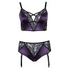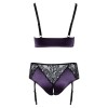 Бюстгальтер и стринги с подвязками, без промежности, от Cottelli CURVES изготовлены из элегантного сочетания фиолетового атласа и нежного черного кружева. Бюстгальтер отличается перекрещивающимися эластичными бретелями на декольте, а стринги с высокой талией выделяются смелым открытым дизайном в области промежности. Широкие эластичные бретели бюстгальтера регулируются для идеальной посадки. Ремешки для чулок на стрингах также регулируются и снимаются.