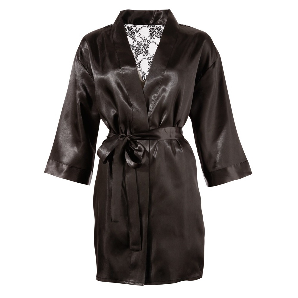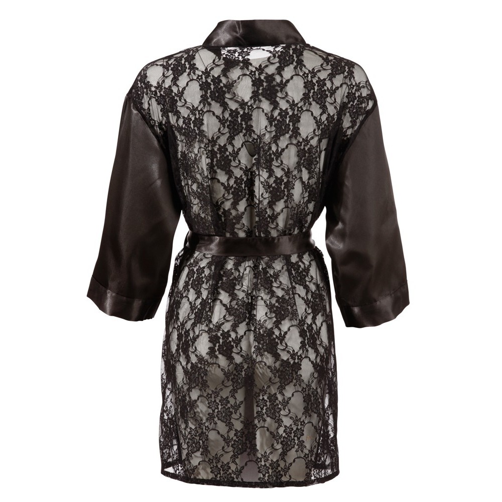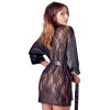 Короткое платье с рукавами, застегивающееся спереди на небольшой бант и со съемным поясом на талии. Изготовлено из мягкого бархатистого атласа, задняя часть полностью выполнена из полупрозрачного кружева с цветочным узором, создавая соблазнительный эффект.
