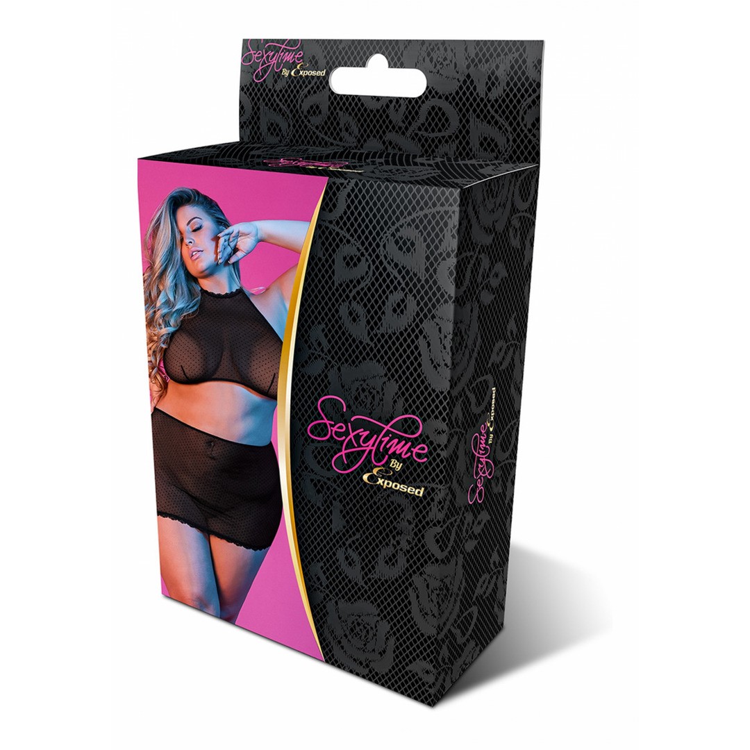 Эта модель из коллекции Exposed by Magic Silk включает топ с застежкой-гачком в форме буквы S на шее и спине, а также мини-юбку в тон. Двухкомпонентный комплект из мягкого трикотажа с элегантным дизайном и чувственным оттенком.