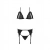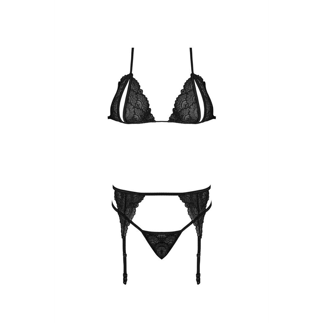 Этот комплект из коллекции Exposed by Magic Silk включает бюстгальтер-хомут с мягкими кружевными чашками и сексуальными вырезами, эластичные плюшевые бретели на шее и спине, пояс для чулок с застежкой-крючком сзади, регулируемые ремешки с металлическими застежками и кружевные детали с фигурными краями, а также классические стринги в тон.